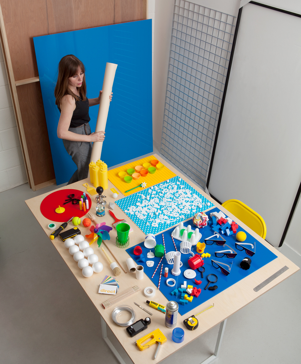 We’re often asked to explain what goes into Elise’s complex, beautiful images, but describing this in words is no mean feat. Elise’s photographs are unique in that she does everything herself: making, drawing, building, shooting and retouching. Her studio is an extension of the playful visual world she represents in her pictures, full of her handmade crazy objects, paint tins, polystyrene and lighting stands. We thought we’d share with you some ‘behind the scenes’ shots of Elise at work so you can see for yourself.
